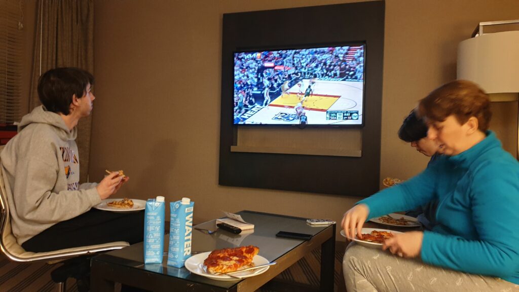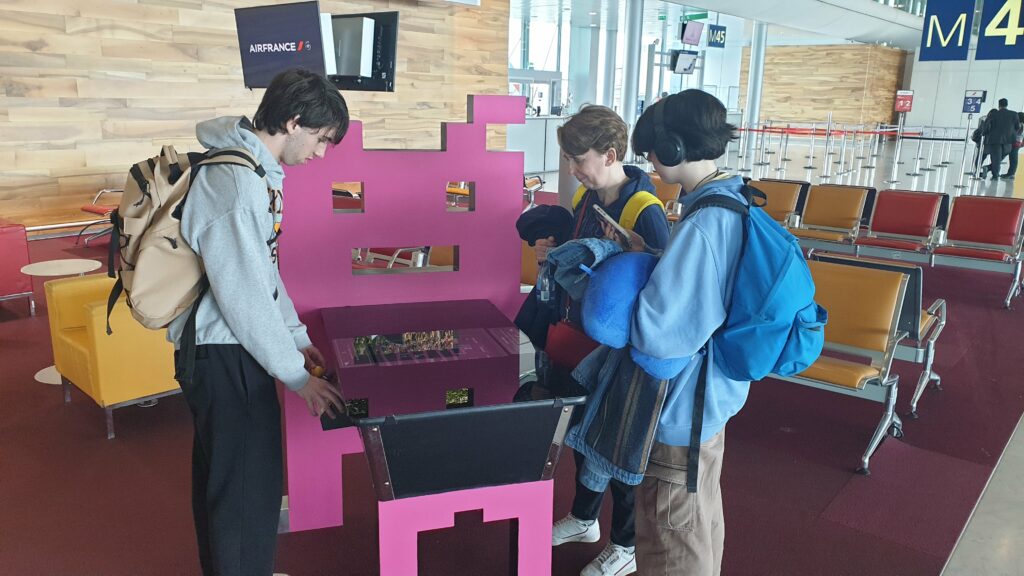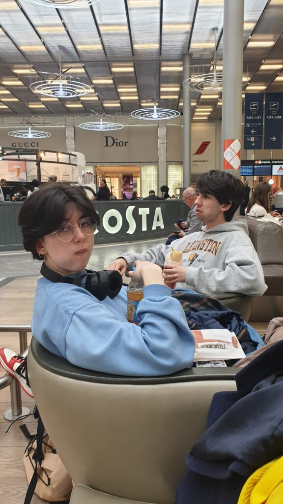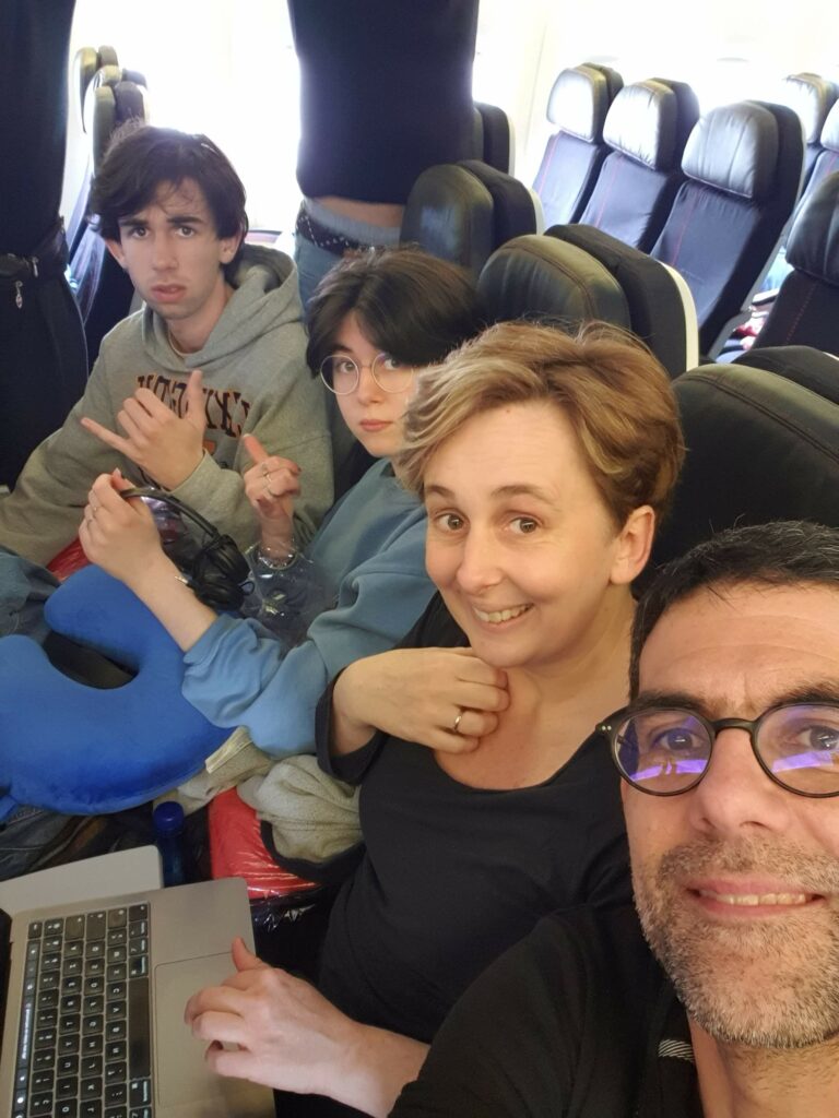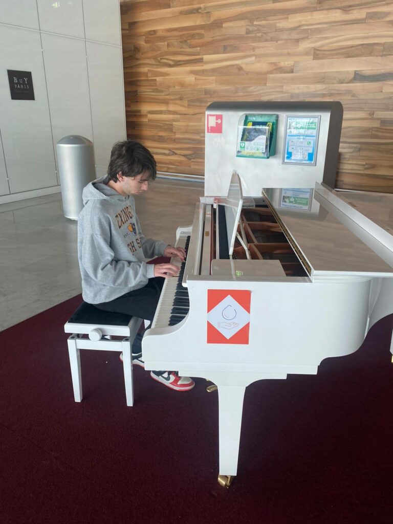 Trajet RER sans encombre (quelle chance !!) et formalités à l’aéroport plutôt rapides. Nous nous retrouvons avec environ deux heures d’avance en salle d’embarquement. Il faut donc s’occuper un peu. Au programme : sandwiches, piano et jeux.