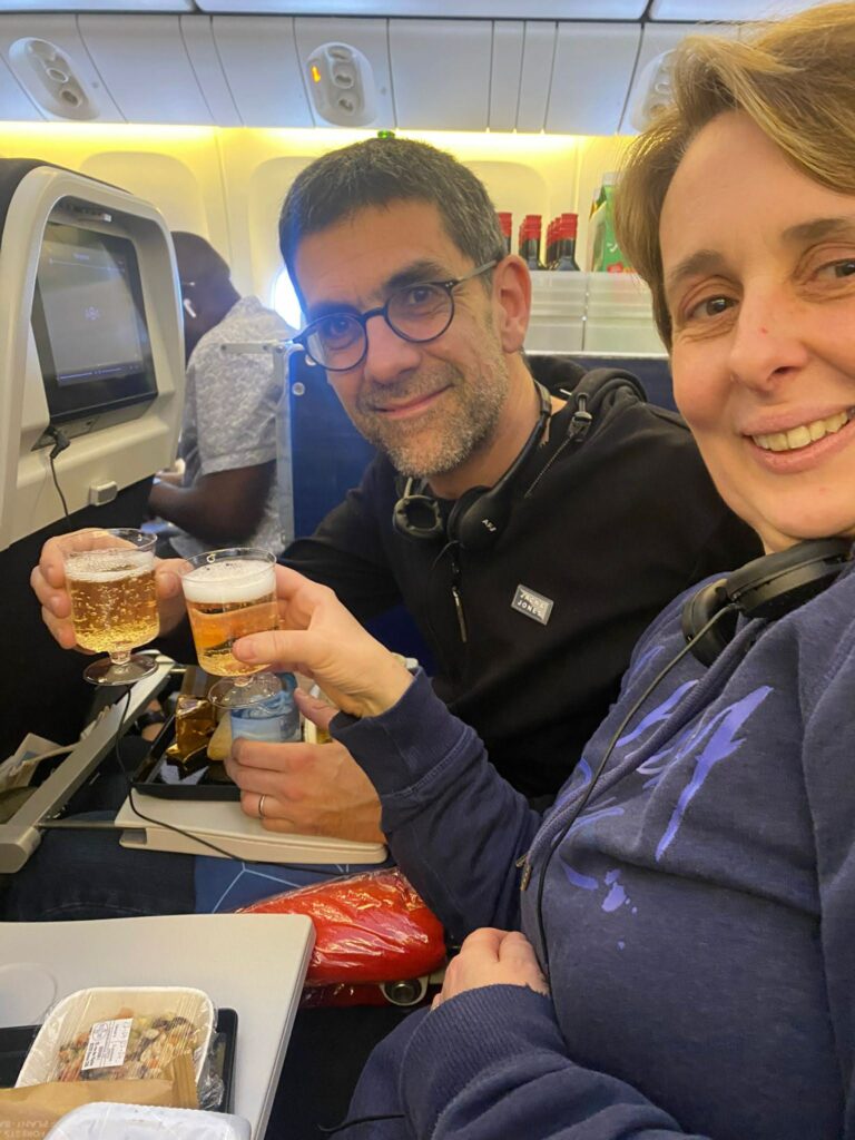Peu après le décollage, c’est l’heure du repas. Pour arroser nos noces de cretonne, on s’autorise une petite coupe de champagne en plein ciel.