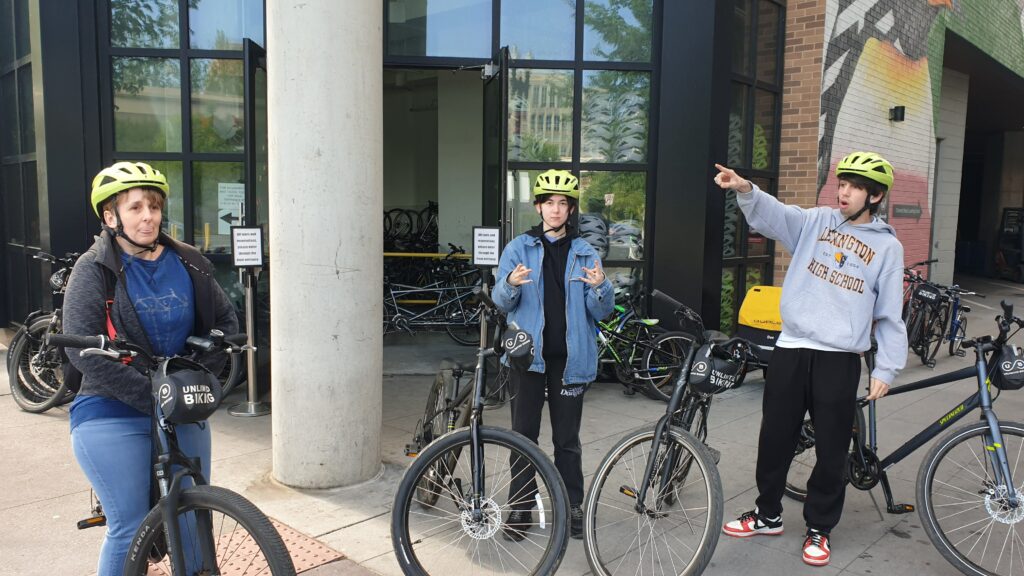 Nous voilà équipés et tout beaux avec nos casques jaunes !