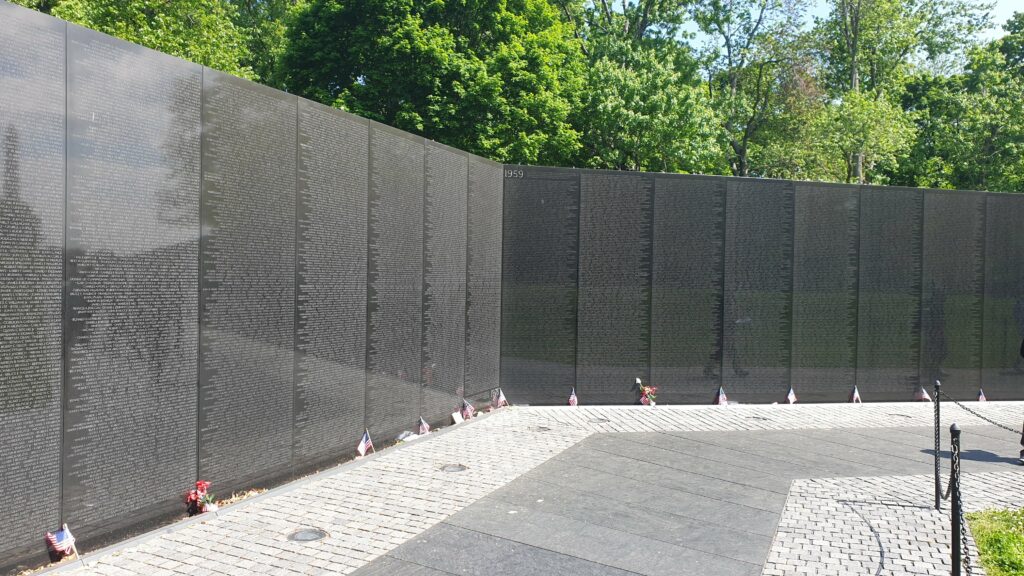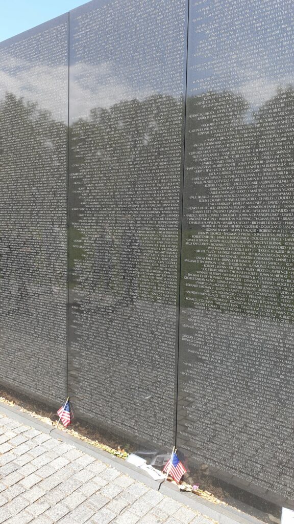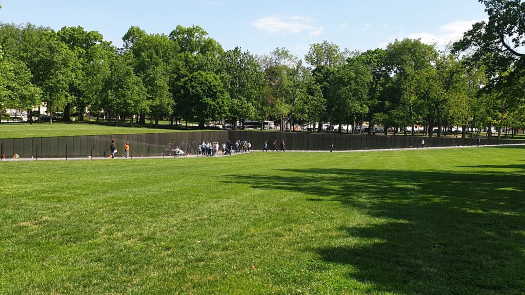 Au bout de Constitution Gardens, nous arrivons au Vietnam Veterans Memorial : un immense mur en forme de V sur lequel sont inscrits les noms des 58 000 soldats américains morts au Vietnam.