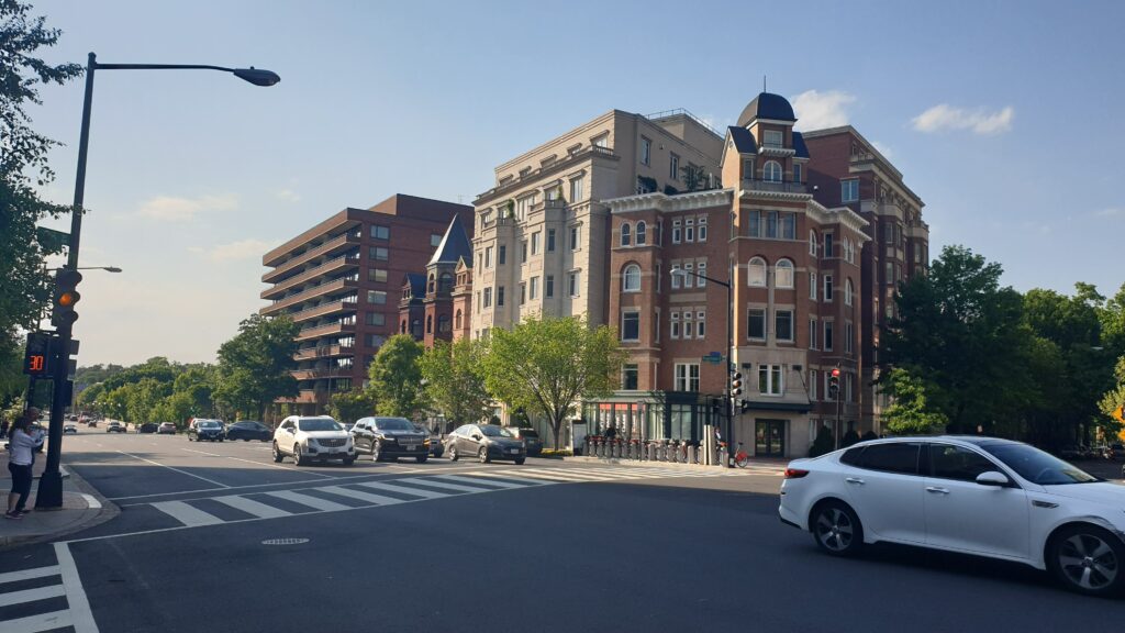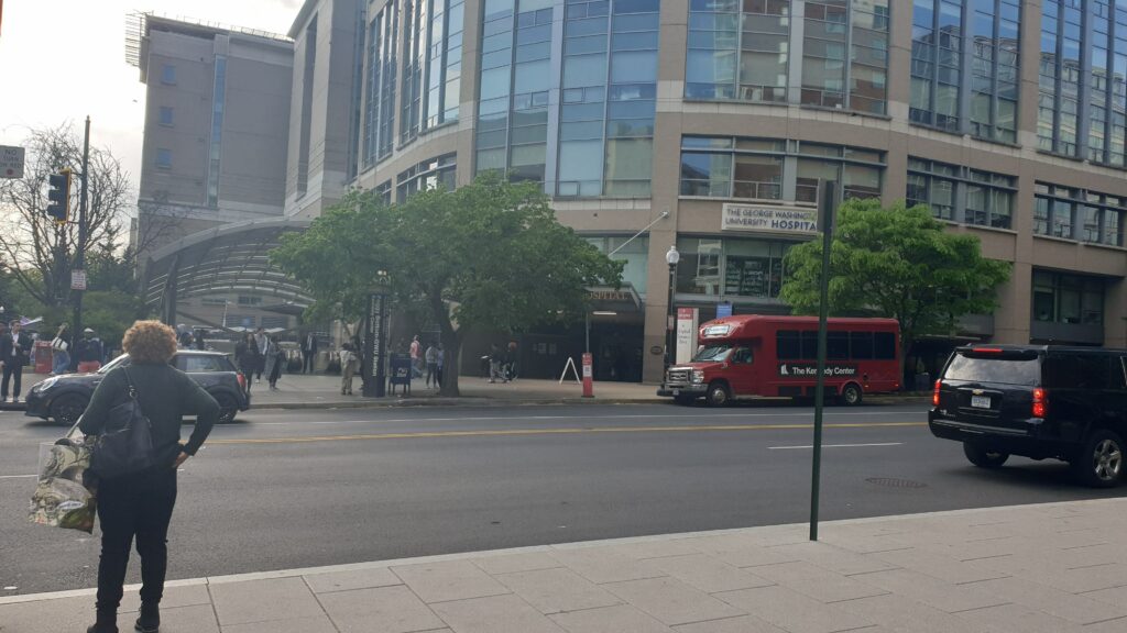 Nous sommes tout près du grand hôpital universitaire de Washington : le George Washington University Hospital. La station de métro Foggy Bottom dans laquelle passent trois lignes se trouve à l’entrée de l’hôpital.
