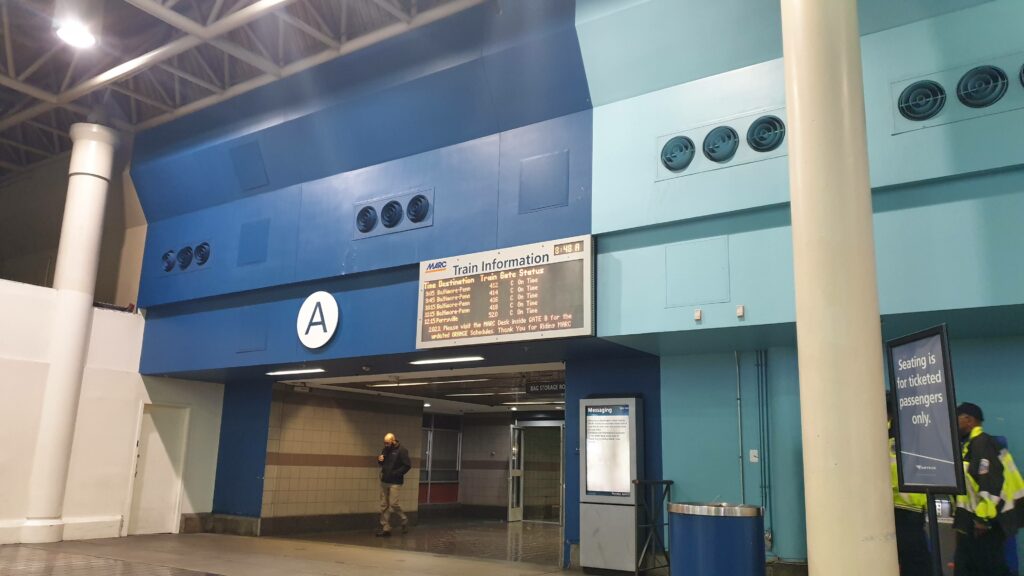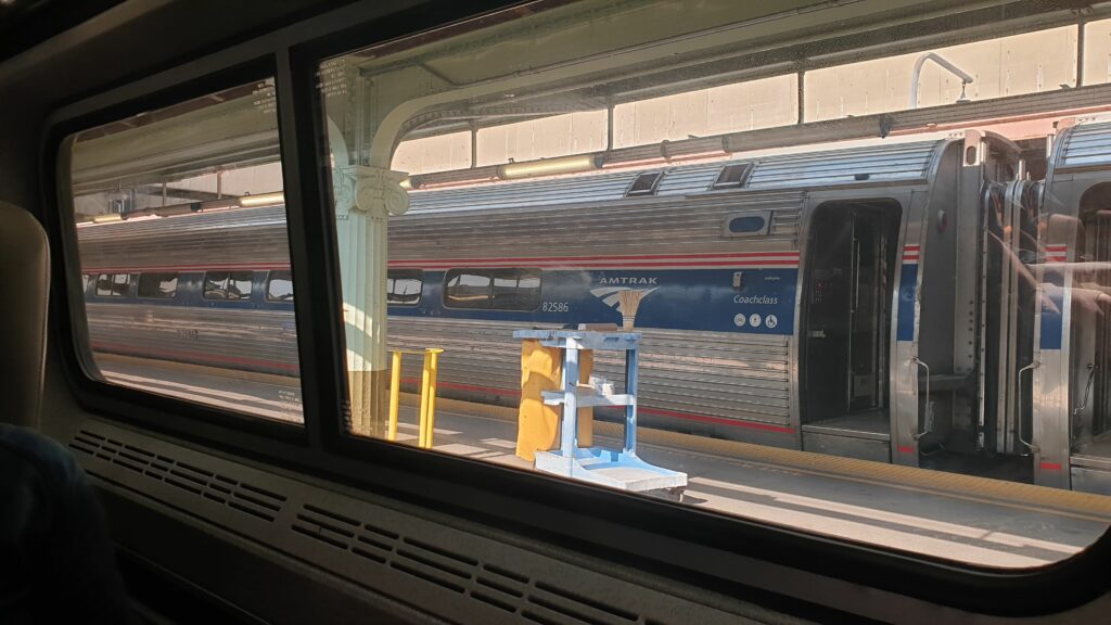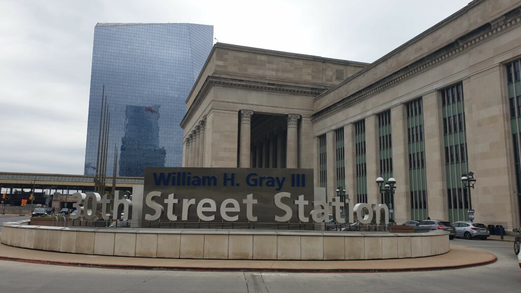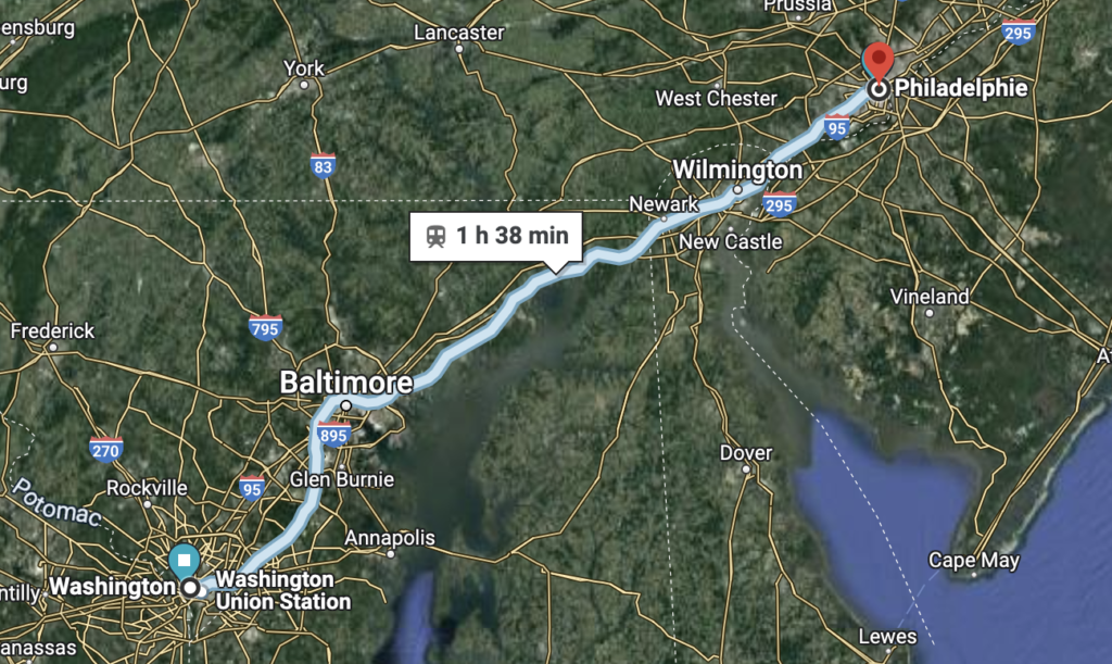 Nous passons donc dans plusieurs états et faisons un certain nombre d’arrêts (Baltimore dans la Maryland, Wilmington dans le Delaware puis Philadelphie en Pennsylvannie). Il y a environ 230 km entre les deux villes et le train, qui n’est pas un TGV roule malgré tout à environ 180 km/h.