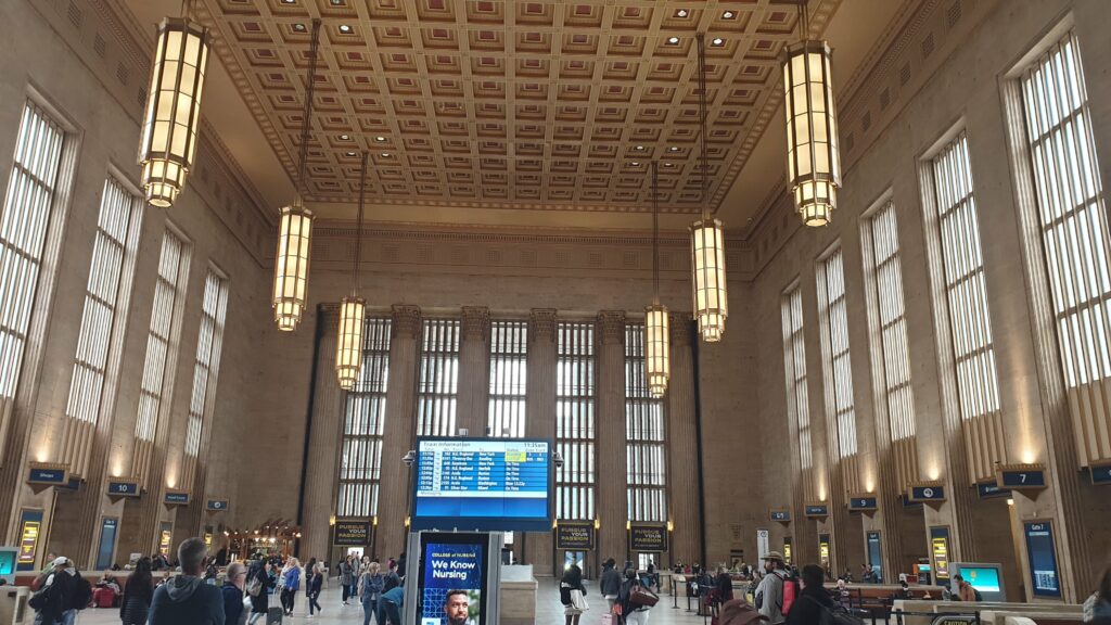 Aujourd’hui, direction la gare Union Station de Washington pour nous rendre à notre deuxième étape : Philadelphie. Nous expérimentons le chemin de fer américain, pas hyper bien organisé il faut dire et notre expérience commence avec 25 minutes de retard et un quai jamais annoncé qu’il a fallu chercher nous-mêmes…