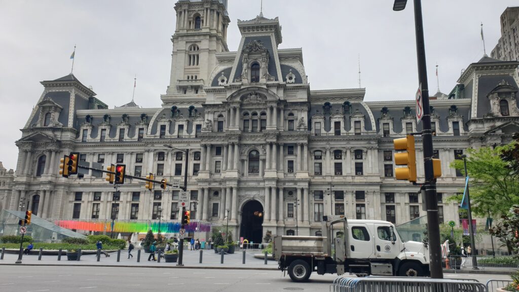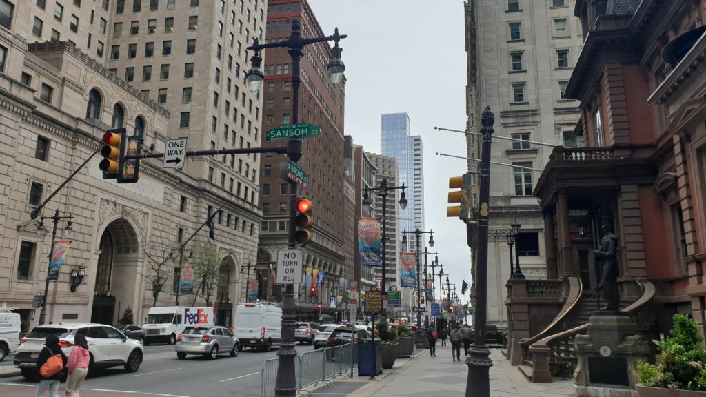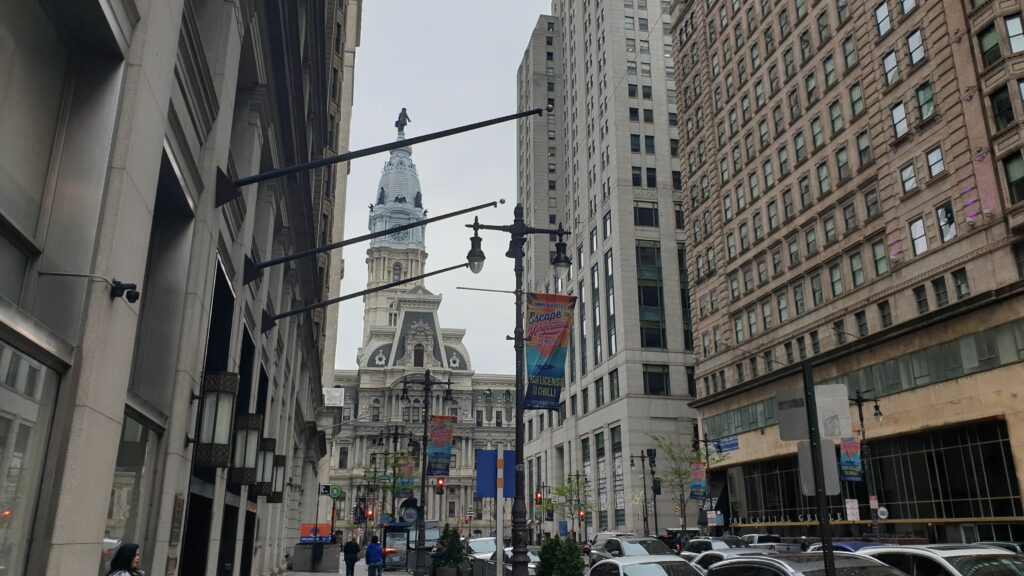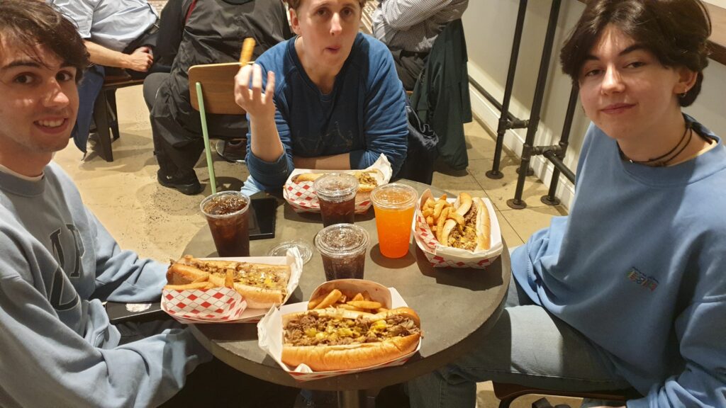 On sort arpenter les rues de la ville et nous nous dirigeons vers notre visite réservée pour 14h. Comme on a un peu de temps devant nous, nous rejoignons une sorte de marché couvert qui abrite plusieurs stands de restauration à emporter pour gouter le fameux cheesesteak de Philadelphie (https://fr.wikipedia.org/wiki/Cheesesteak_de_Philadelphie). C’est une sorte de kebab avec de la viande de boeuf découpée en tranche avec du fromage. C’est servi avec des frites et un soda, bref, c’est léger…