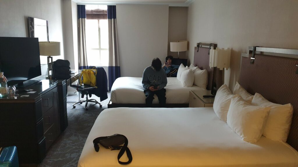 Notre chambre se trouve au 17e étage d’un bel hôtel.