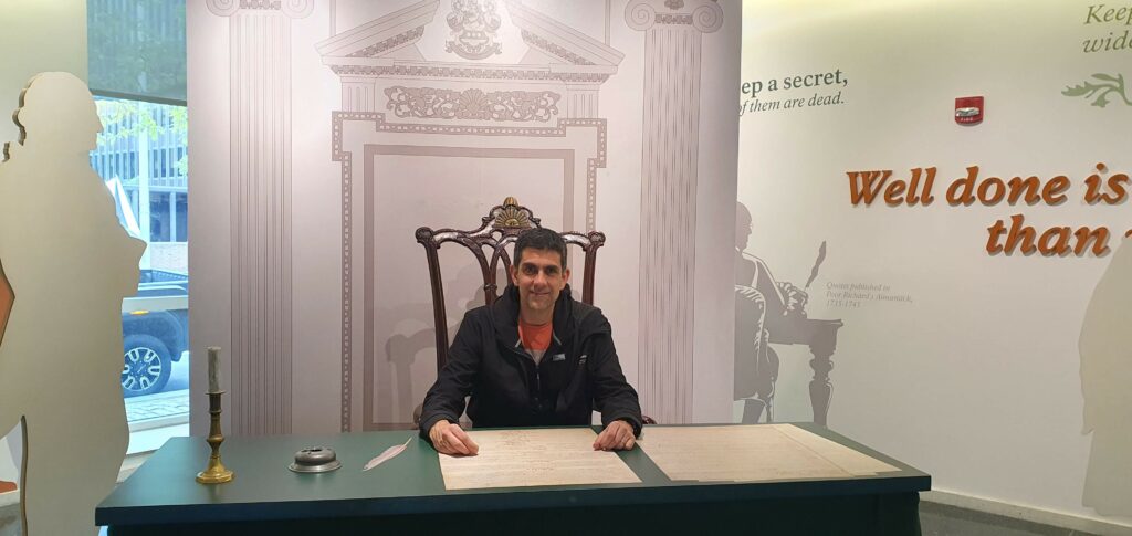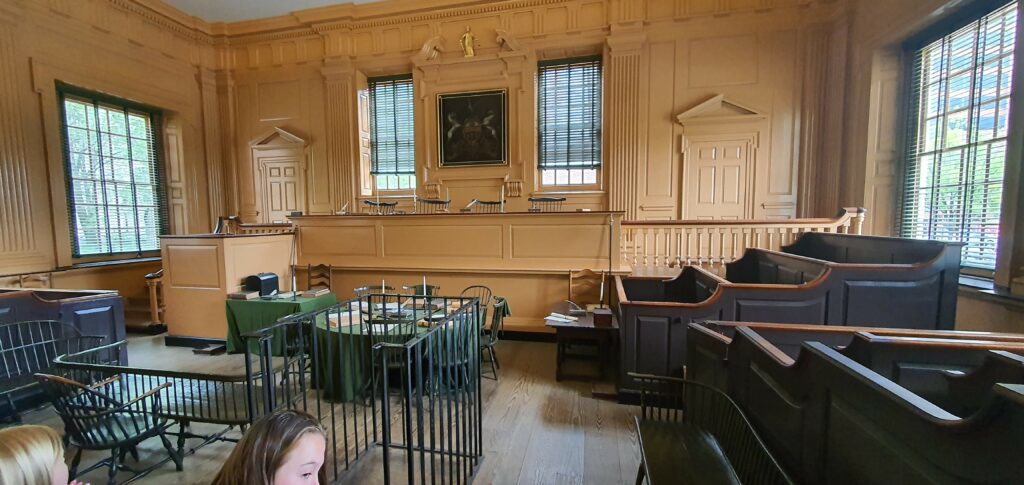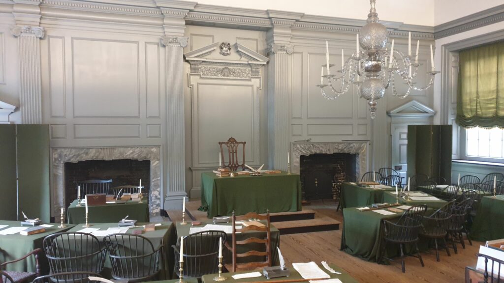 Nous visitons deux salles à l’intérieur : une salle qui était un tribunal et la salle où furent signées la déclaration d’indépendance et la Constitution. Dans la deuxième salle, le bureau sur l’estrade au fond était celui de George Washington.