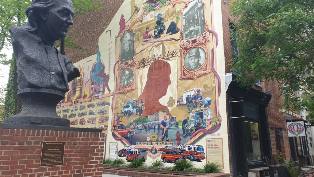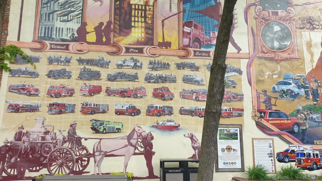 Suite de notre balade : Philadelphie est également connue pour ses très nombreuses fresques murales qu’on croise au hasard des rues. Nous tombons sur celle-ci à côté de la caserne des pompiers.